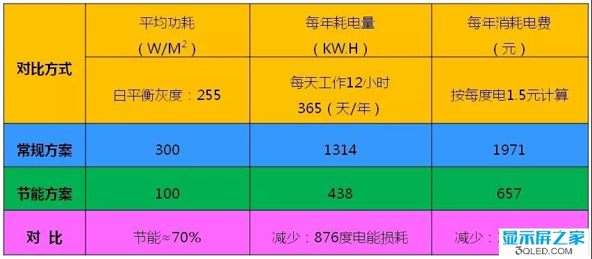 綜合采用LED節能方案產品對比普通產品,每平米每年可節約876度電能,按1.5元/度電費計算,每平米每年可節約1314元,如下表(采用P10-1平米進行對比數據):4SvLED顯示屏廠家|江蘇迷你光電有限公司