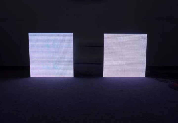 測試開始10min后,我們用肉眼觀察兩個(gè)屏體的白平衡畫面,不難發(fā)現(xiàn),共陽顯示屏由于長時(shí)間高溫高亮環(huán)境下引起的溫度分布不均,導(dǎo)致溫漂現(xiàn)象出現(xiàn),畫面開始出現(xiàn)色塊(如下圖)。